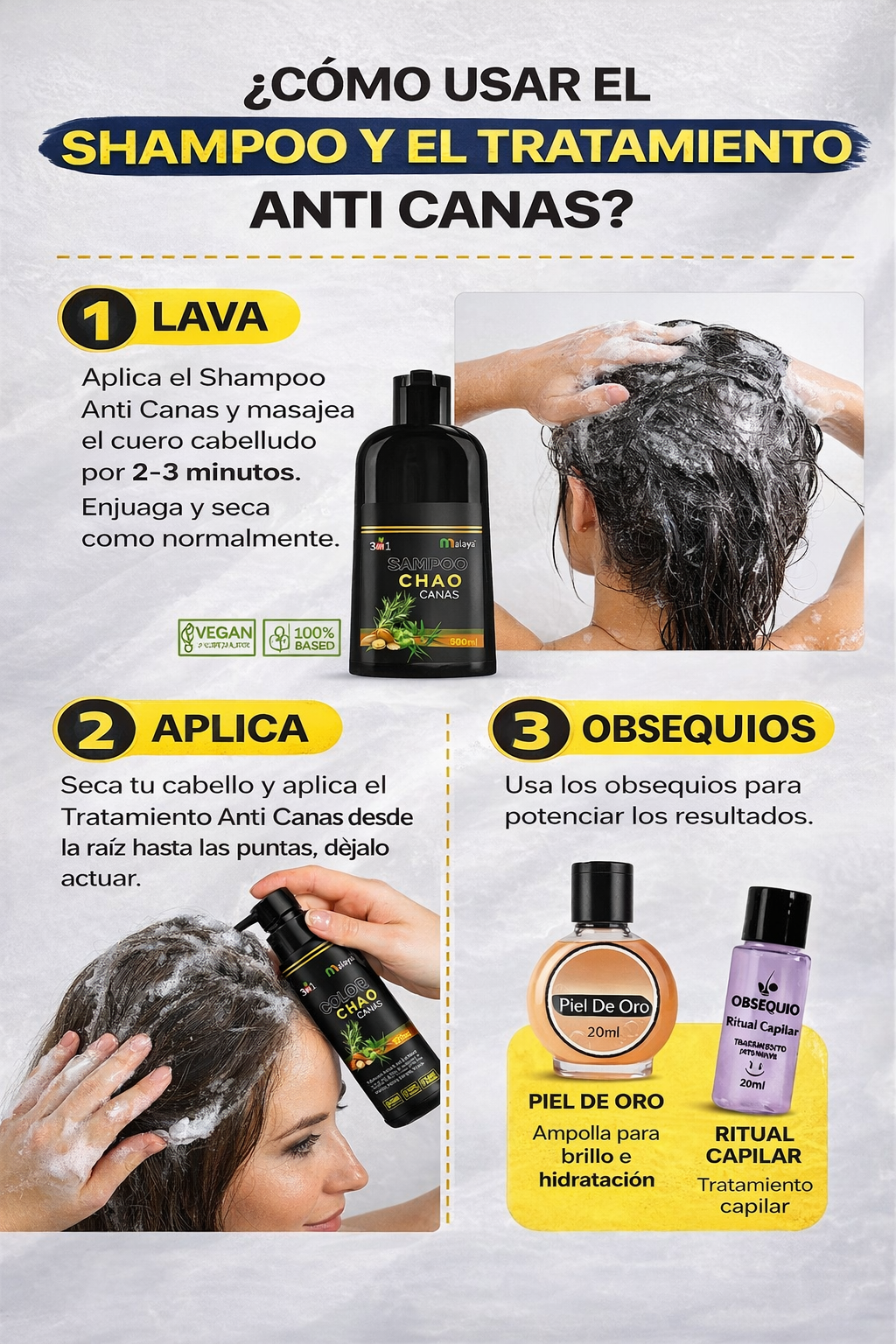 “Llevo usando el shampoo hace casi un mes y me ha gustado mucho. El cabello me queda más suave y las canas ya no se notan tanto. Además llegó rápido y bien empacado.”