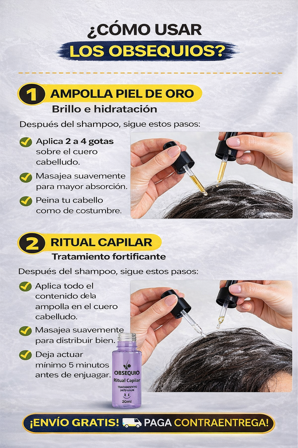 “El combo vale totalmente la pena. El shampoo rinde bastante y los obsequios me encantaron, sobre todo la ampolla piel de oro, deja el cabello brillante.”